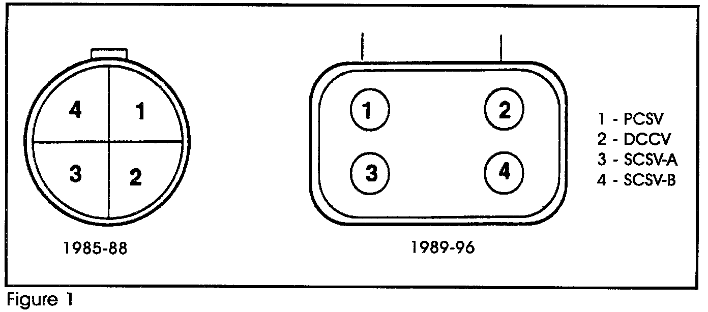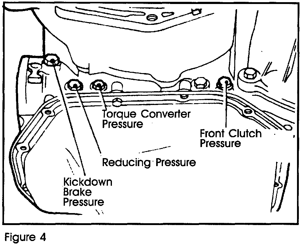 Connect a pressure gauge to the torque converter pressure tap (figure 4). Normal pressure is approximately 50-70 psi with the lock-up off (29-34 psi for 1985-86 models). When lock-up is commanded on, pressure will drop to 0-10 psi. If this occurs, the problem is in the torque converter. If pressure does not drop when commanded, either the damper clutch control valve is stuck or the damper clutch control solenoid valve has failed.