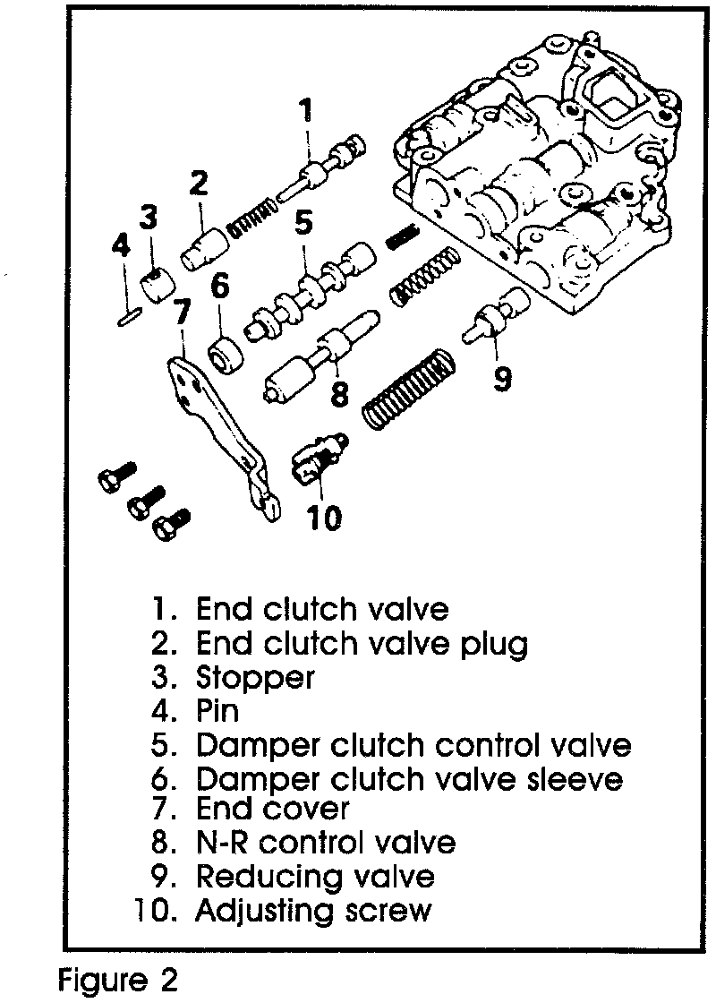 Remove the lower portion of the valve body, and block the damper clutch control valve in the direction the spring pushes it (figure 2). Reinstall the lower portion of the valve body. If the engine stalls when the transaxle is in gear replace the pump or the torque converter. If the engine does not stall, then replacement of the damper clutch control solenoid valve (DCCSV) or the valve body may be required.