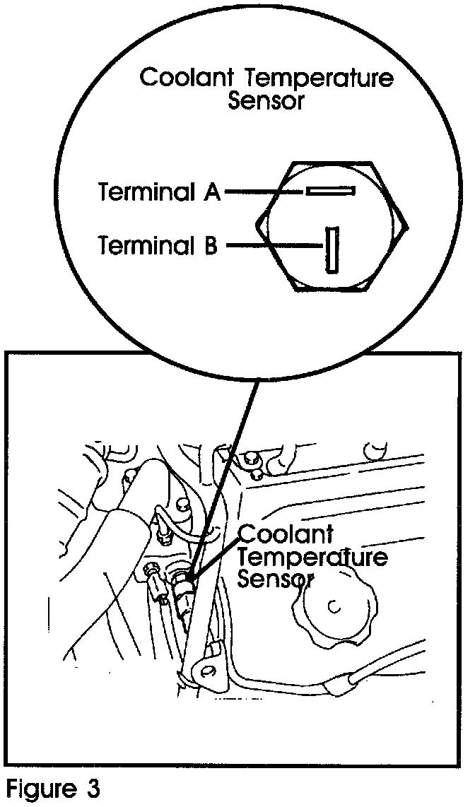 Check for voltage at the DCCSV terminal on the solenoid connector (figure 1). This should be done while driving the vehicle. If voltage is present go to step four. If voltage is not present perform a diagnostic of the TCU. On models without an ATF temperature sensor, an engine coolant sensor determines operating temperature. There is no code for the engine coolant temperature sensor; nor can it be checked by monitoring serial data with a scan tool. To check the sensor, simply unplug the sensor connector and check for voltage at terminal B (figure 3). It should be approximately 12 volts. If not check the connection between the TCU and engine coolant sensor terminal B. If voltage is correct ground terminal B of the connector and road test the vehicle. If the damper clutch engages, replace the engine coolant sensor.