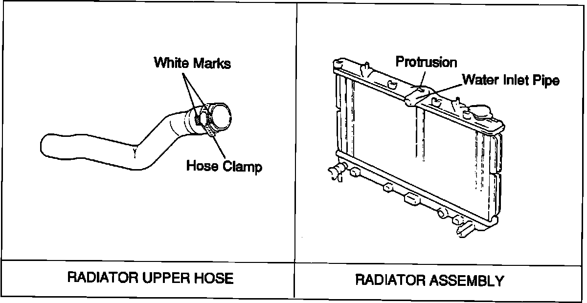 White marks have been applied on the radiator end of the upper hose to indicate the installation position of the hose damp. When assembling the hose to the radiator, position the hose with white marks upward and in line with the protrusion of the water inlet pipe. Position the hose clamp between the marks and tighten.