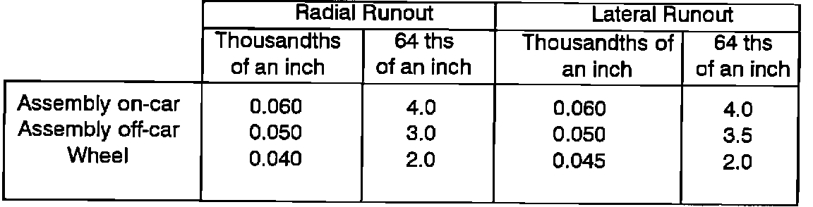 If there is a large difference in runout measurements from on-vehicle to off-vehicle, the runout variation is due to either a vehicle condition (for example, bolt circle or hub runout) or the fit between the vehicle and the wheel.