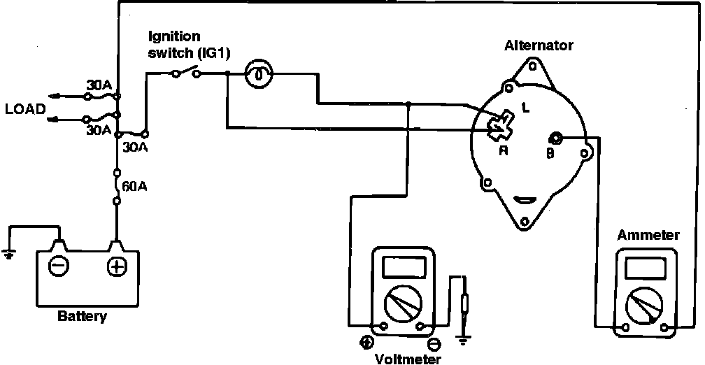2. Disconnect alternator output wire from alternator B terminal, then connect a DC ammeter in series between the B terminal and the disconnected output wire. Connect positive lead of ammeter to B terminal. Connect negative lead to the disconnected output wire.