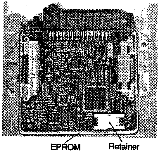 4. Install the new EPROM carefully with the notch in the EPROM matching the notch in the socket. Use extreme caution not to bend the pins of the EPROM. Reinstall the white retainer.