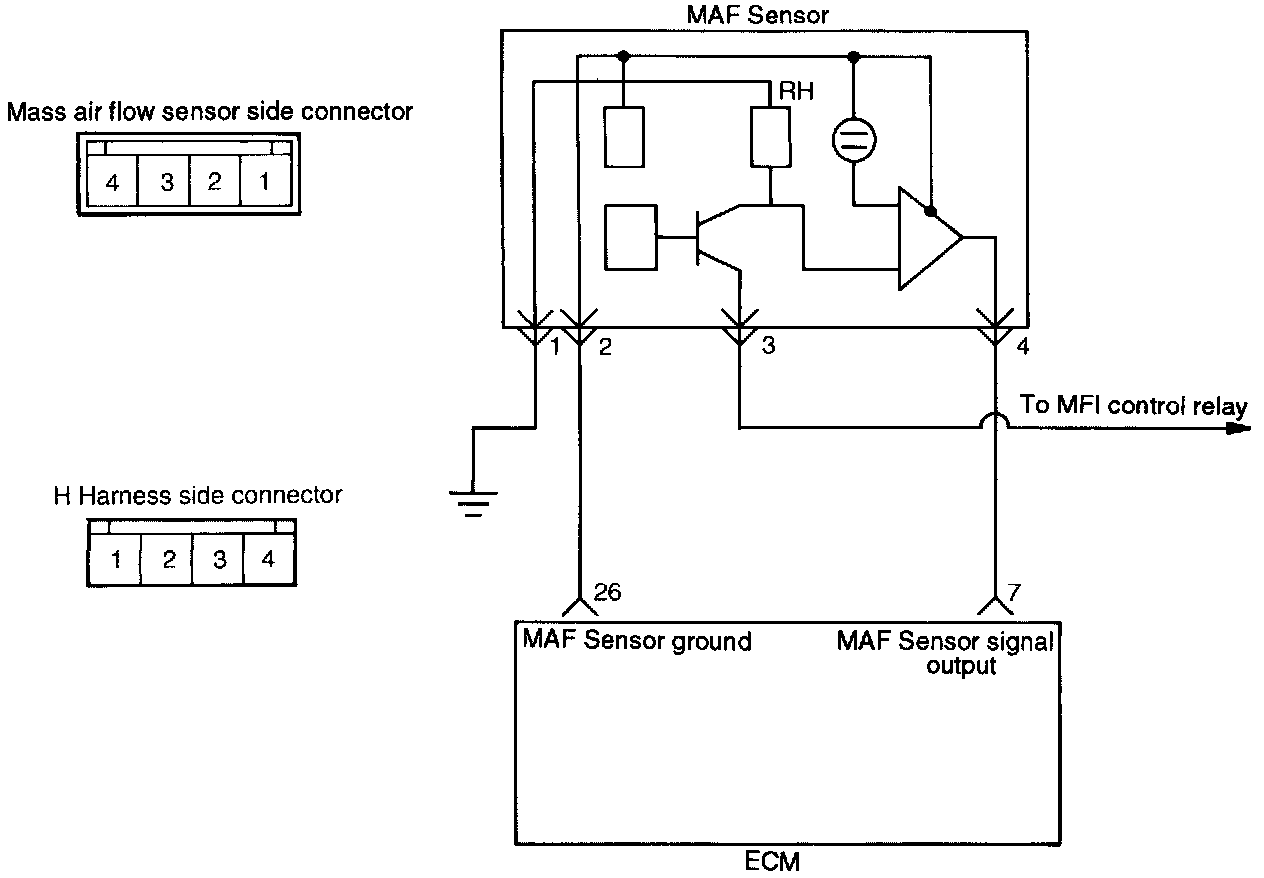 1. If the engine stalls occasionally, crank the engine and shake the mass air flow sensor harness. If the engine stalls, check the poor contact of the mass air flow sensor connector.