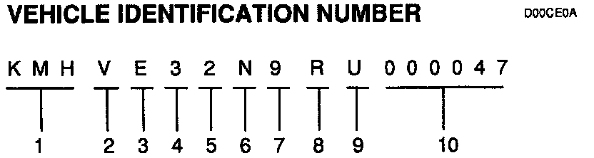 The vehicle identification number is stamped on the upper right side of the cowl top front panel and contains the following information.