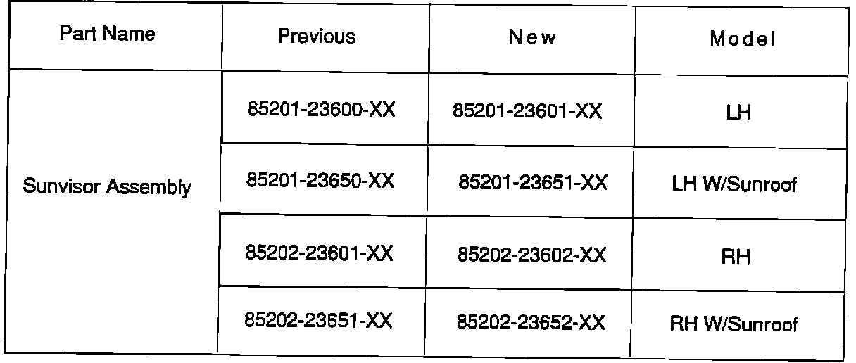 The material on the headliner side of the sunvisor was changed to cloth to reduce vinyl squeaks on rough and semi-rough road surfaces.