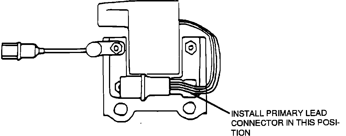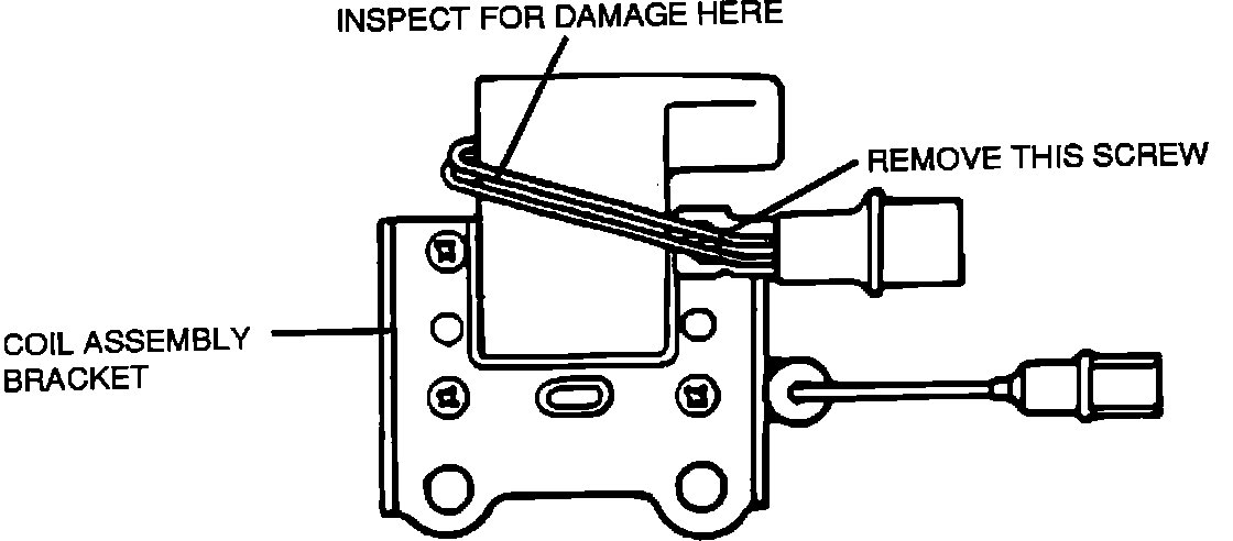3. Remove the screw that attaches the primary' ignition coil connector to the coil assembly bracket. Inspect the underside of the primary ignition coil leads where they cross over the back edge of the coil. It there is any damage to the coil leads or abrasion of the insulation, the coil must be replaced. If no damage is present, proceed to step 4.