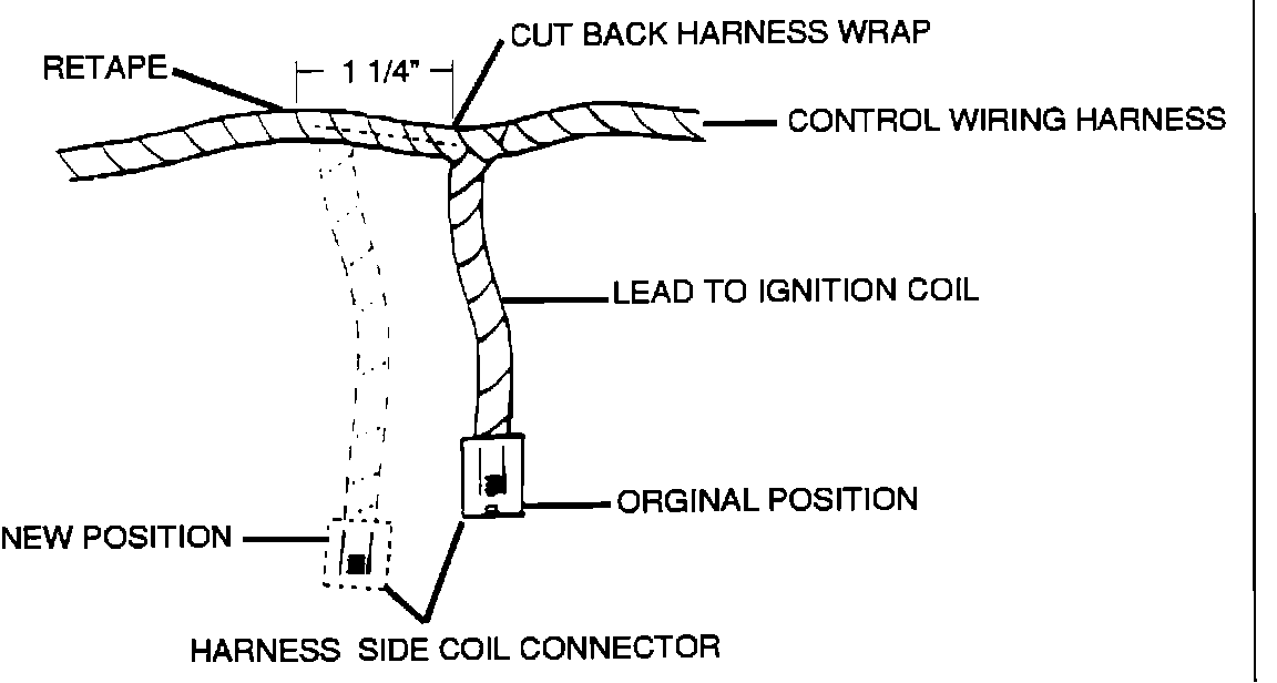 9. The new position of the ignition coil primary lead connector requires a longer lead from the control wiring harness to allow for proper connection. To expose additional ignition coil lead from the control wiring harness, cut back the wrapping on the harness approximately 11/4 inches as shown below. Gently extend the coil lead and re-tape the control wiring harness with the lead in it's new position.