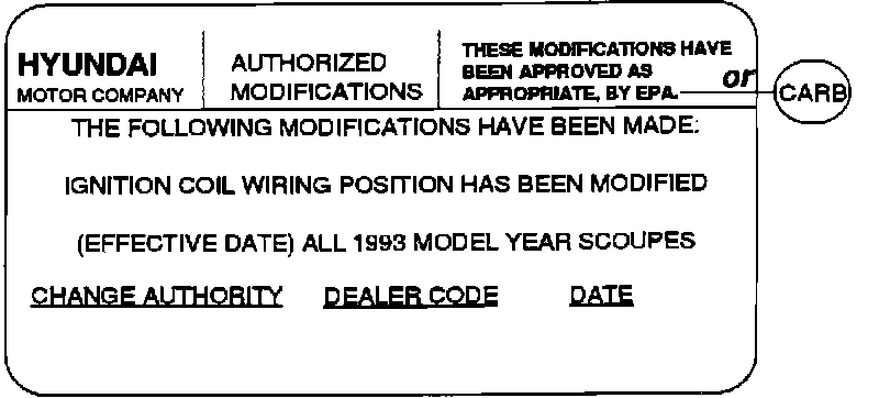California specification vehicles receive a Proof of Completion Certificate (for instructions refer to the California Supplement TSB# 93-O1~OO2) and a label stating the modifications have been approved by CARS. Federal specification vehicles receive a label noting EPA approval.