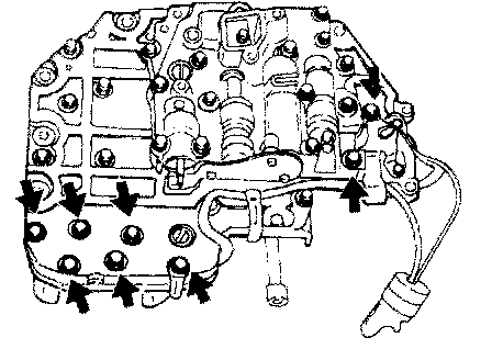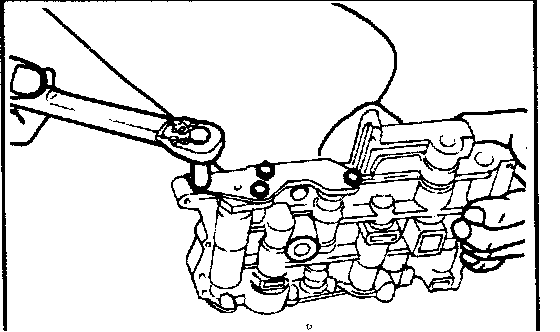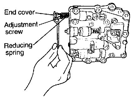25. Remove the three bolts from the lower valve body, and then remove the end cover, adjustment screw, and reducing spring.