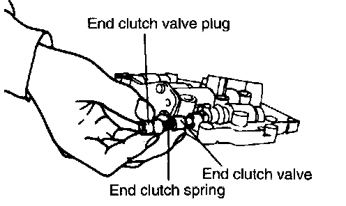 24. Remove the end clutch valve plug, end clutch spring, and end clutch valve.