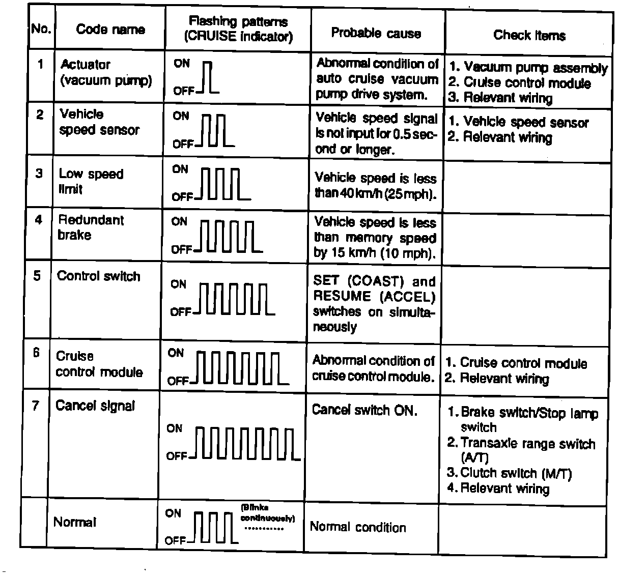 The "CRUISE" indicator on the instrument panel will begin to flash a code describing the condition of the system. The pattern in which the indicator flashes will reveal the specific area needing service. The illustration is an example of how the "CRUISE" indicator would flash code 3.