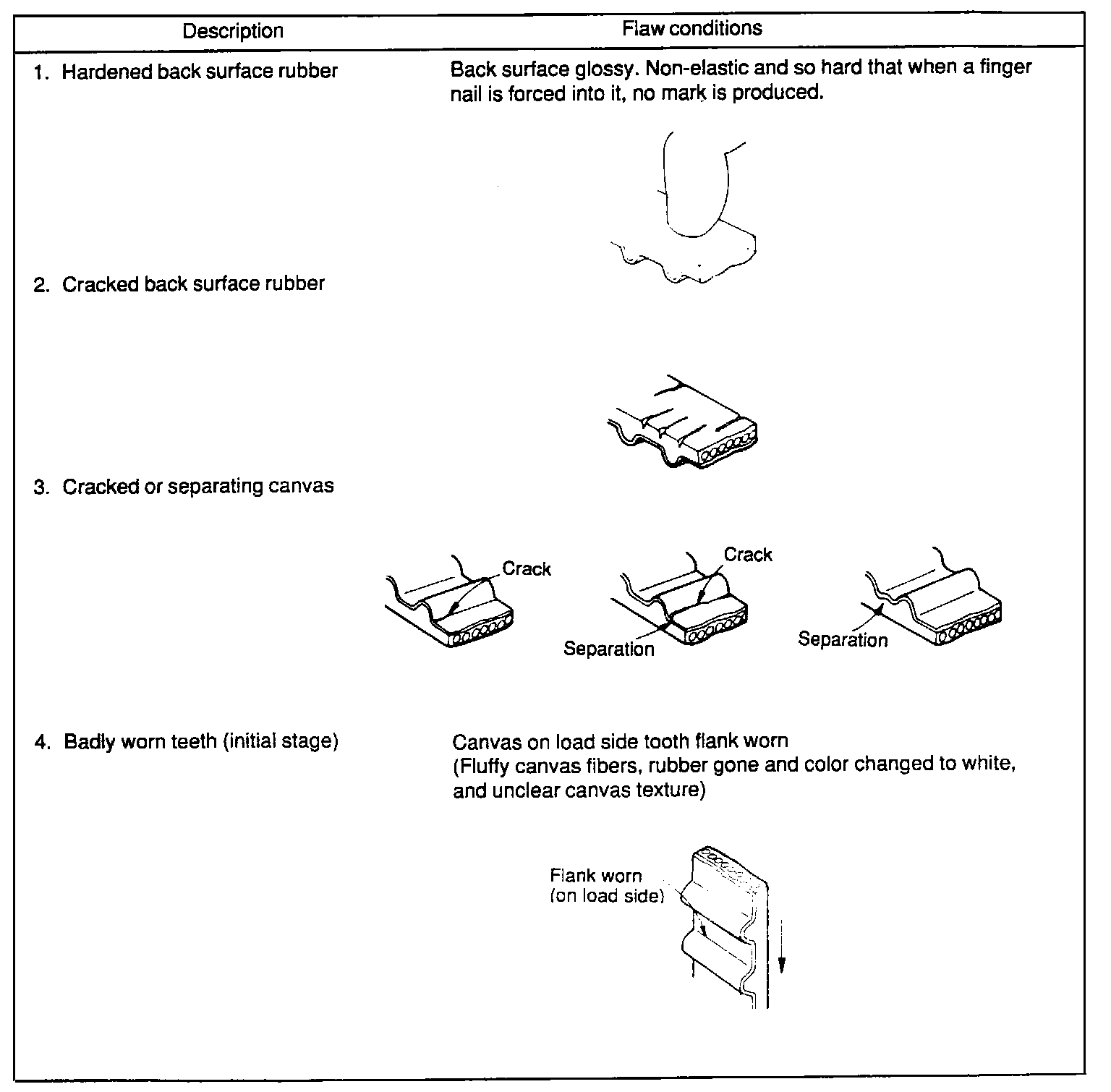 2. When the engine is overhauled or belt tension adjusted, check the belt in detail. If the following flaws are evident, replace the belt with a new one.