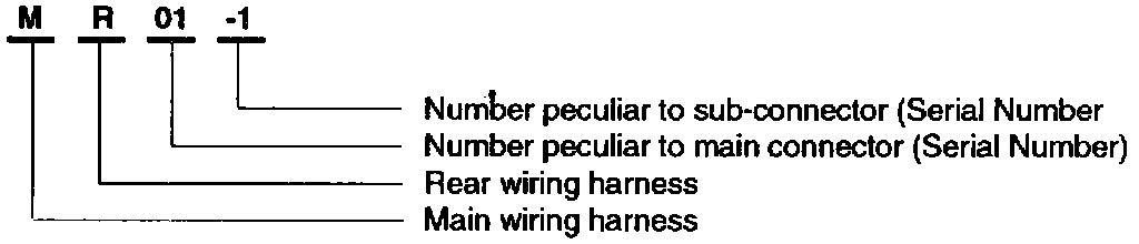 A connector identification symbol consists of a wiring harness location classification symbol corresponding to each other wiring harness location and number peculiar to the connector. These connector locations can be found in the WIRING HARNESS LAYOUT.