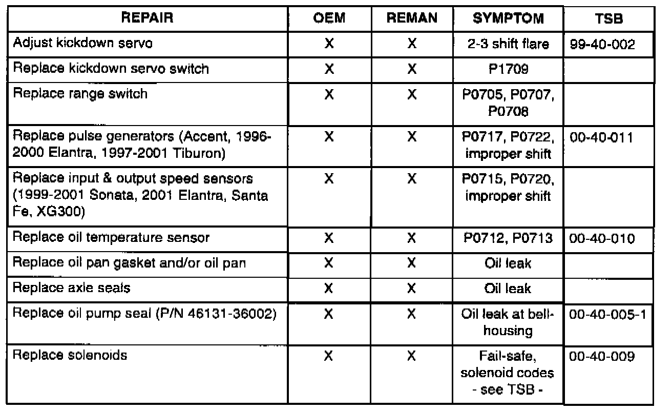 Do not replace the automatic transaxle to service the condition and components listed. Instead, repair/replace the components according to the related shop manual or TSB.