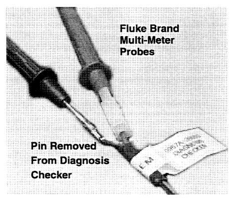 The checker is designed to work with the sharp probes found on most common multimeters. Just push the probe into the female pins in the white plastic connector on the SST. Some multimeters have large handles on the probes, like the Fluke brand. In this case, use a pin removal tool to pop the black wire terminal from the white connector, leaving just the red wire in place. This will allow the multimeter to connect to the SST.