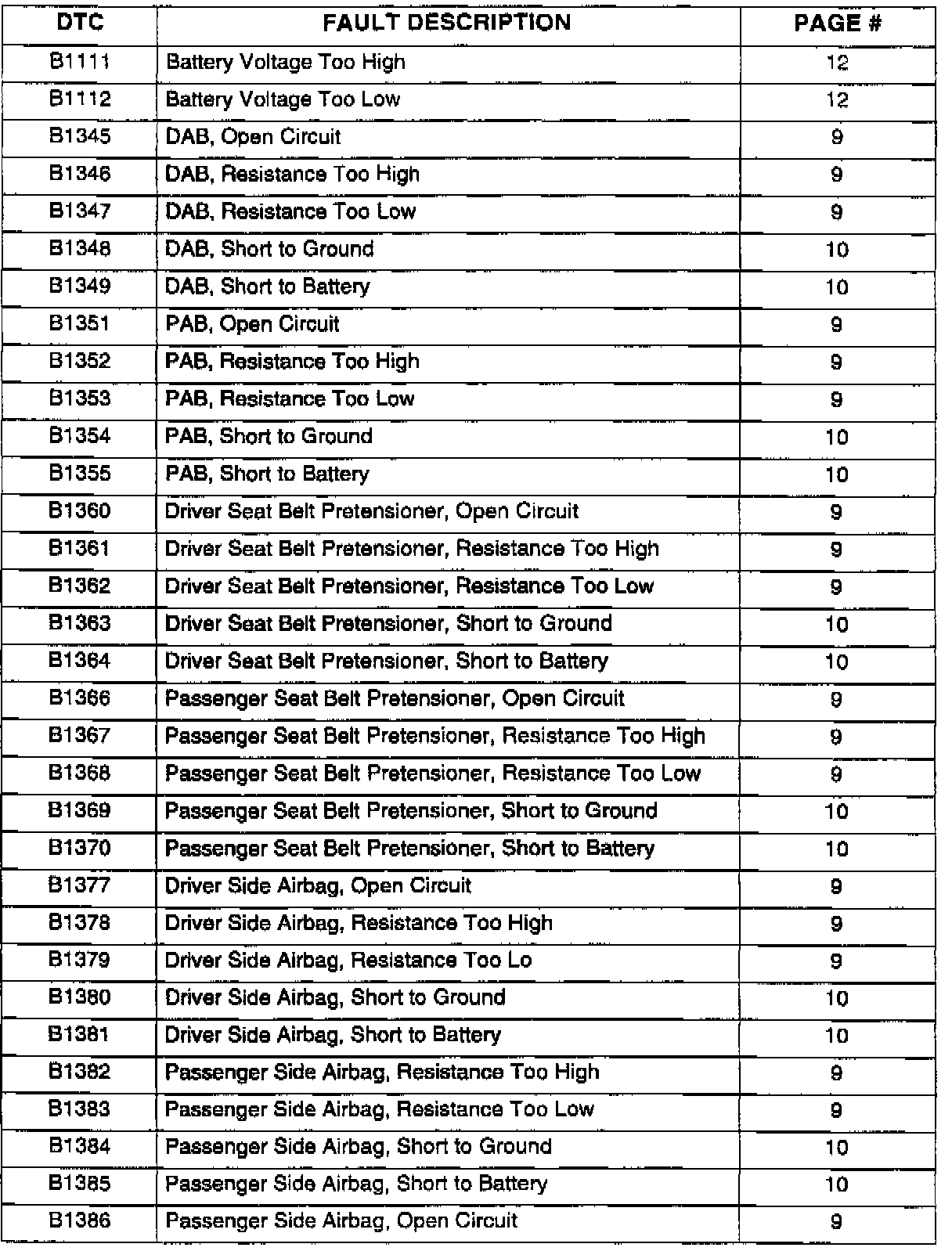 SRS DIAGNOSTIC TROUBLE CODE INDEX