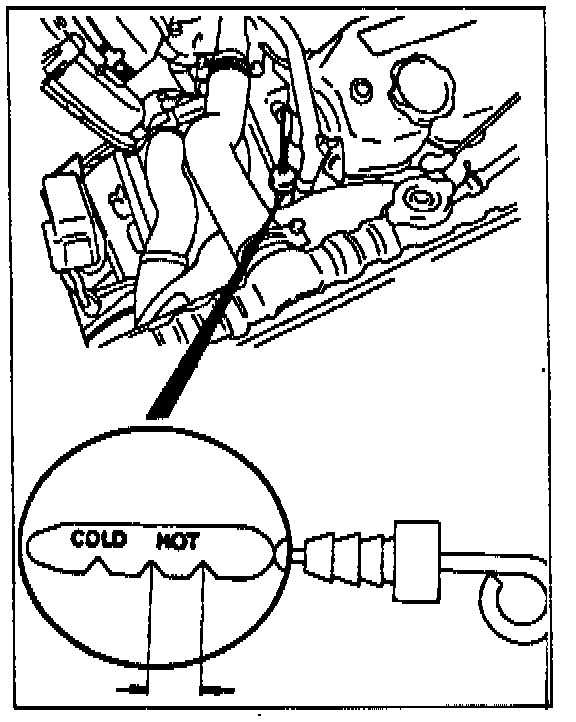 6. Check to see if the fluid level is in the "HOT" range on the dipstick. If the fluid is low, add Hyundai Automatic Transaxle Fluid until the level reaches the "HOT" range. Low fluid level can cause a variety of conditions because it allows the pump to take in air along with the fluid. Air trapped in the hydraulic circuit forms bubbles which will aerate the fluid, causing pressure to be erratic.