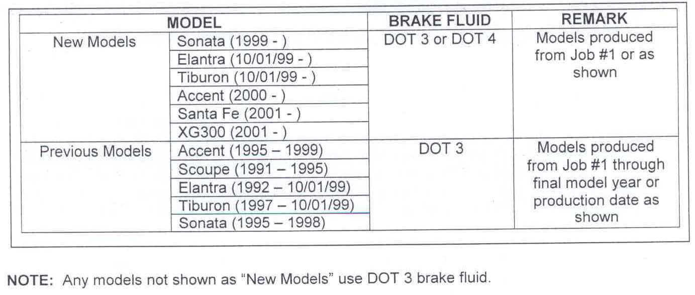 Effective with "New Models" as outlined in the chart, the material of the rubber components used in the brake system has been changed to provide compatibility with "DOT 4" brake fluid. Therefore, both DOT 3 and DOT 4 specifications brake fluid can be used in "New Models", however, only DOT 3 specification brake fluid may be used in "Previous Models".
