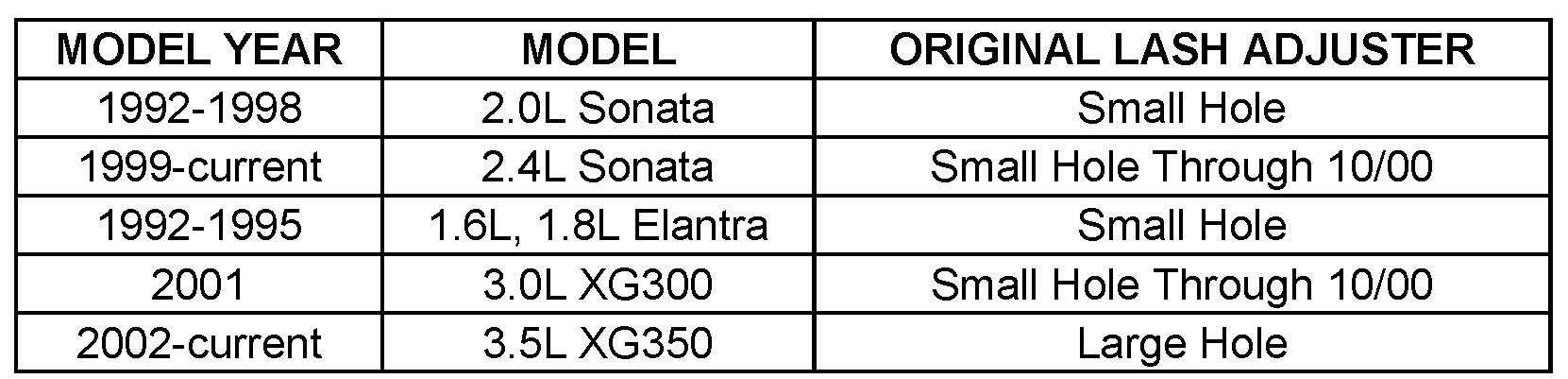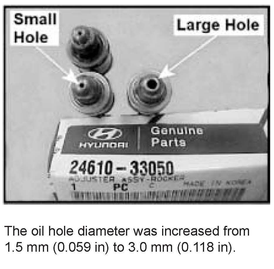 A new hydraulic lash adjuster (P/N 24610-33050) with a larger oil hole has been released to allow for greater oil flow The new large hole adjuster has already been installed on engines produced beginning from October, 2000.