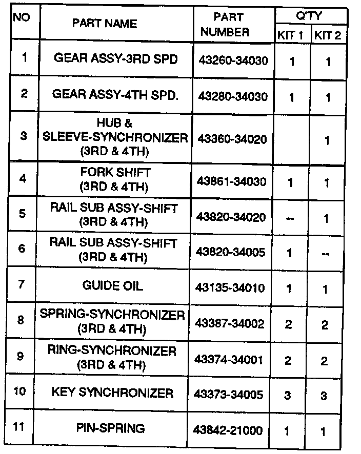 HMC has developed two field fix kits to improve this condition. The kits contain a larger synchronizer hub, sleeve, rings and 3rd and 4th gears. The synchronizer capacity has also been increased. The two kits may be installed into vehicles built before or after March 1, 1993 as shown in the chart in this bulletin.