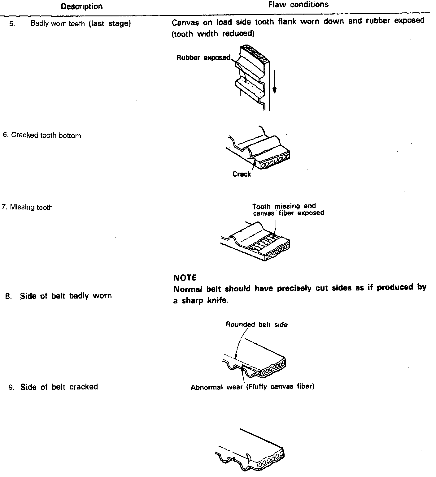 2. When the engine is overhauled or belt tension adjusted, check the belt in detail. If flaws are evident, as shown in images, replace the belt with a new one.