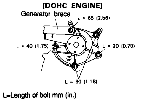 4. Remove the engine coolant pump mounting bolts and then remove the alternator brace.