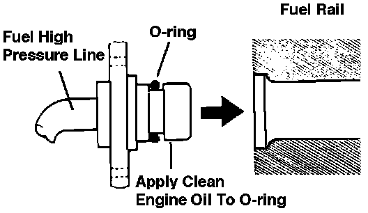 8. When connecting the high pressure fuel hose to the fuel rail, apply fuel to the hose union, and then insert, being careful not to damage the O-ring.