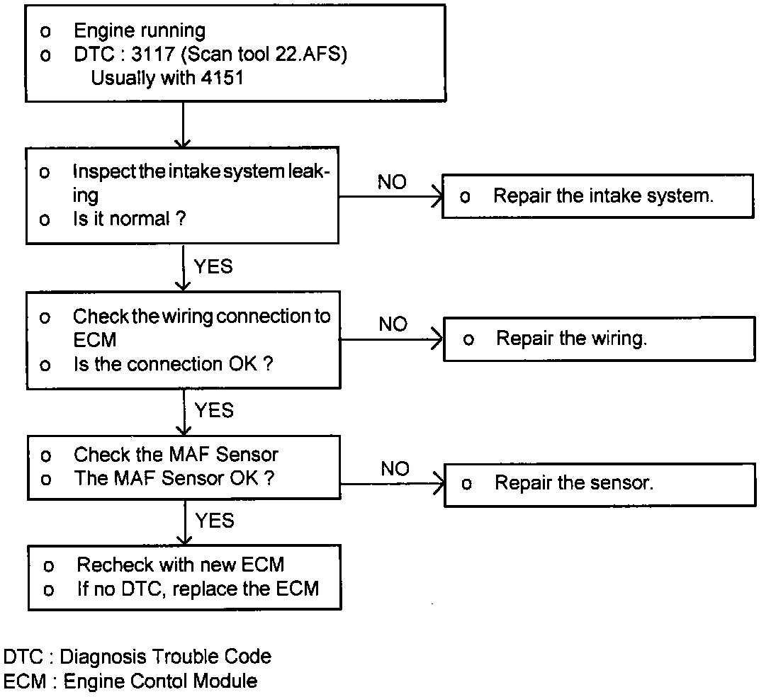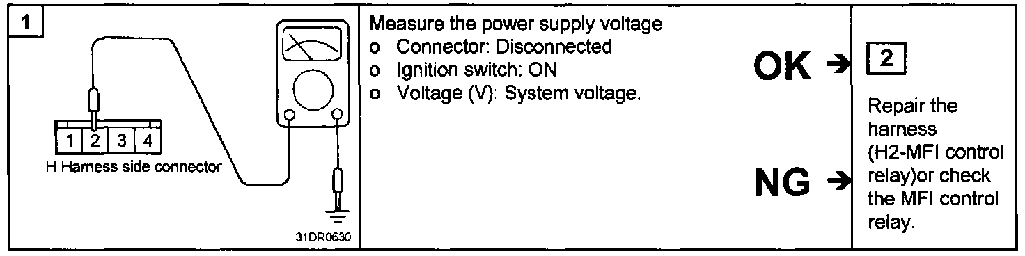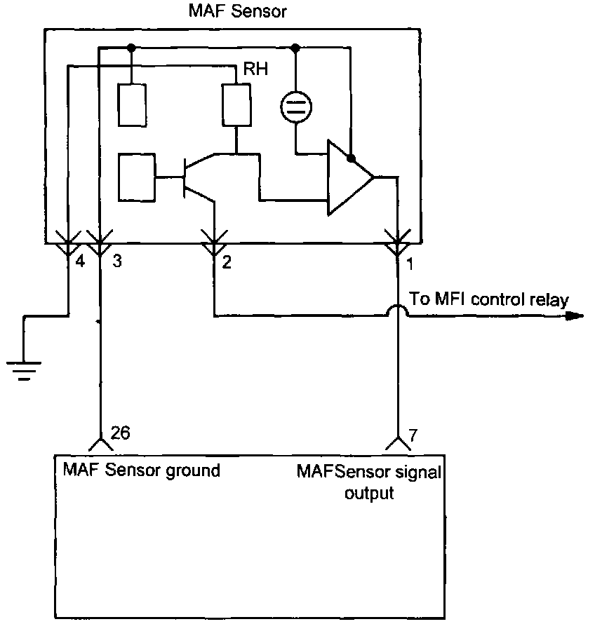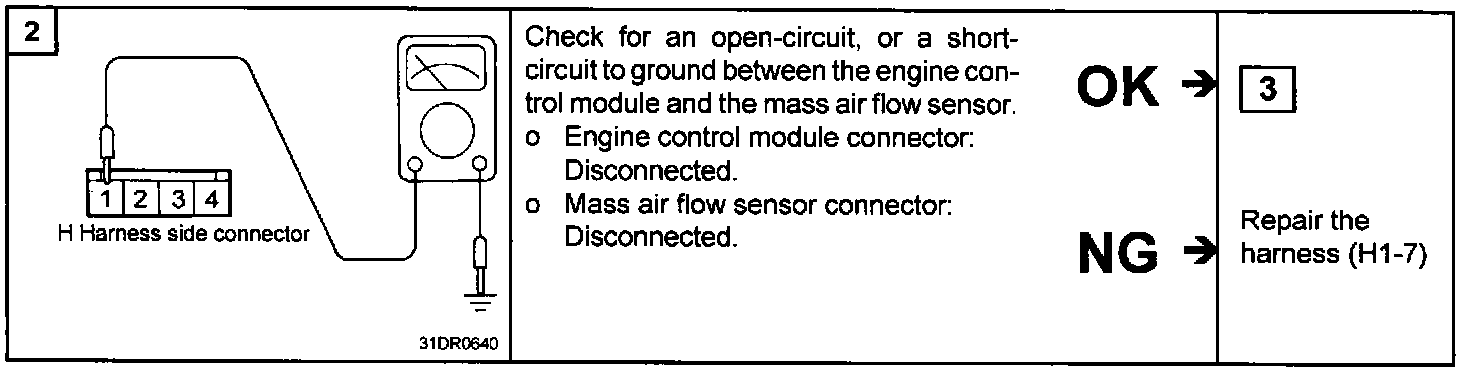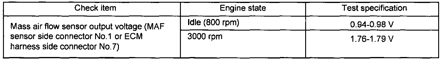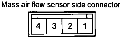 2. If the MAF sensor output voltage is other than 0 when the ignition switch is turned on (do not start the engine). Check for the faulty MAF sensor or Engine Control Module (ECM).