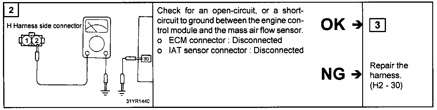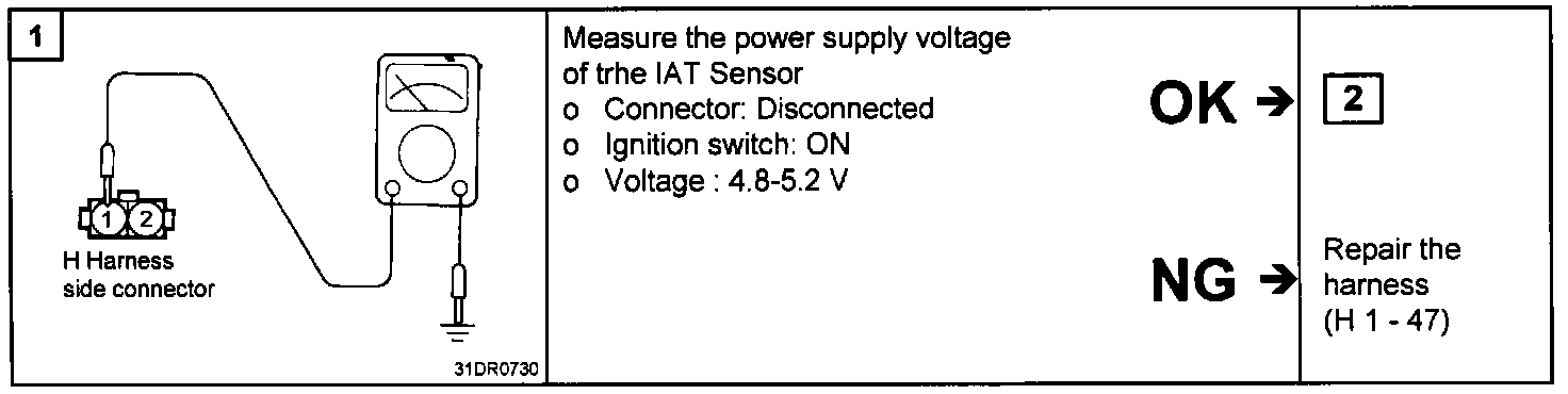 2. Measure the voltage between the Intake Air Temperature (IAT) sensor terminal 1 and 2