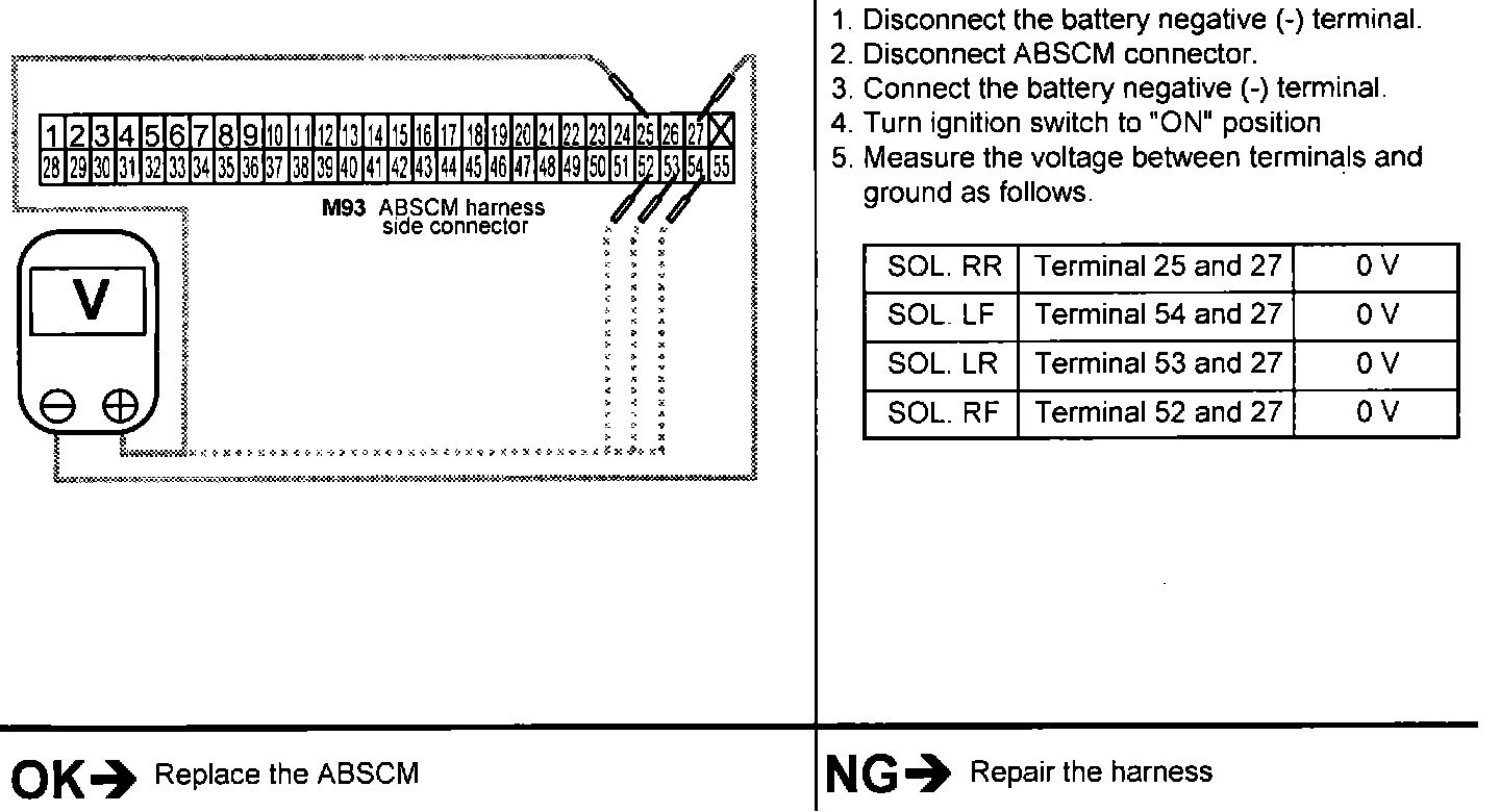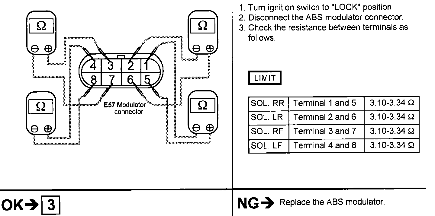 1. Check for voltage between each terminal of the ABS modulator harness.