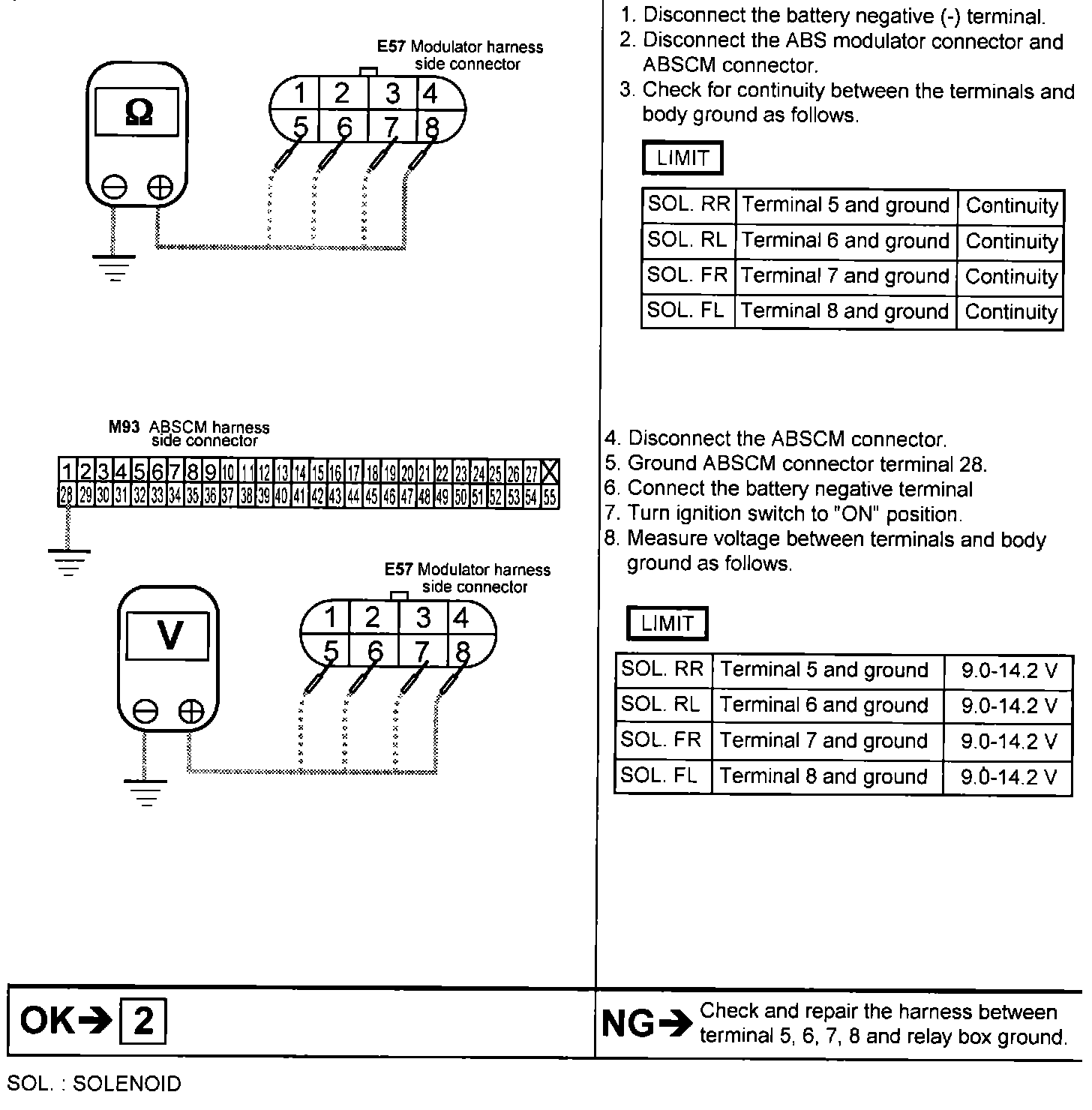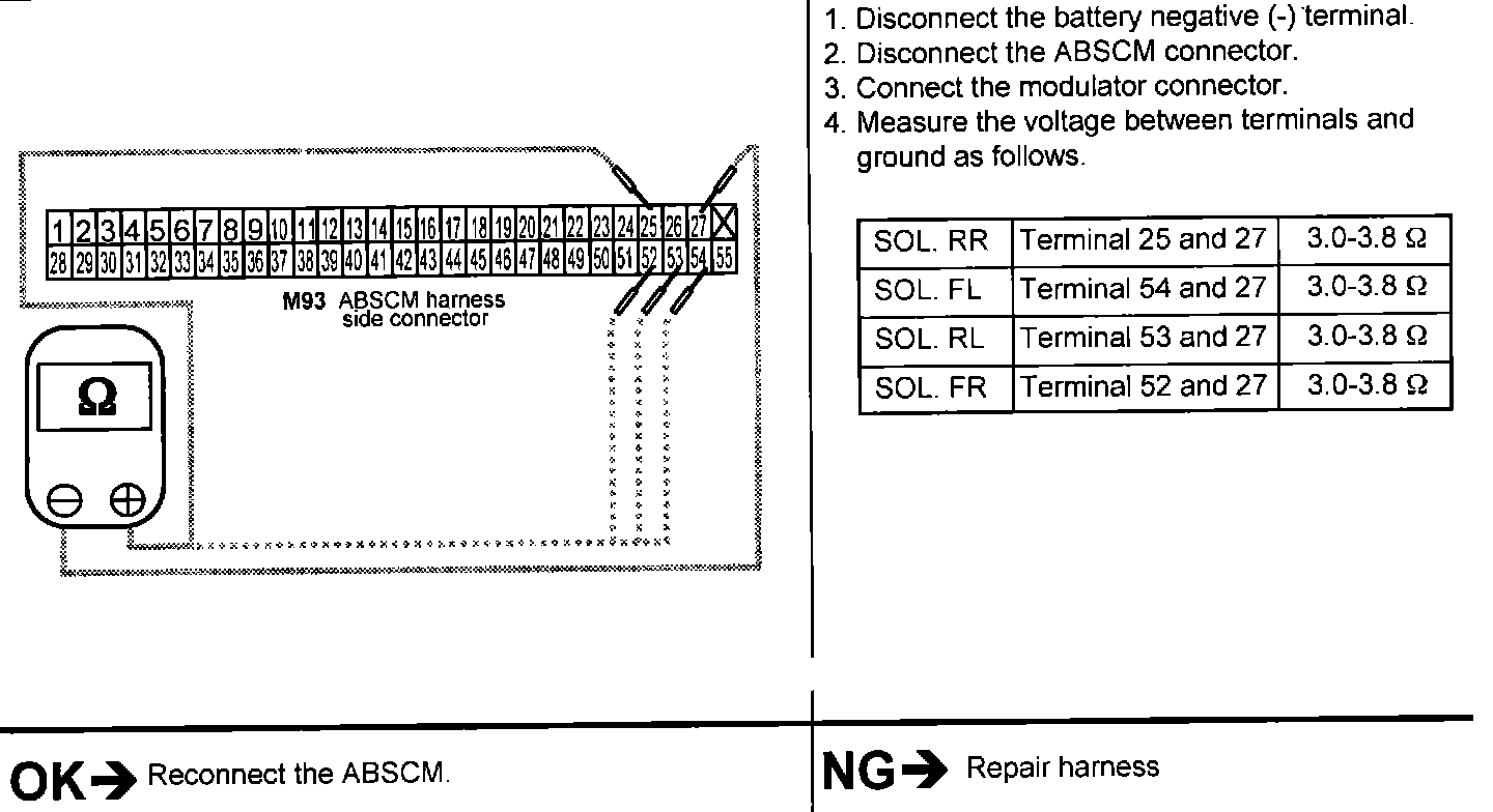 1. Check for continuity between each terminal of the ABS modulator harness.