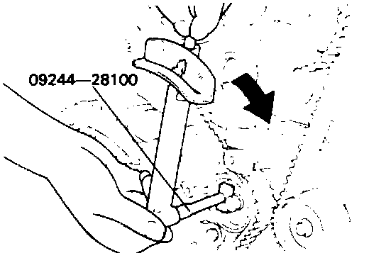 25. Loosen the center bolt, and then, as shown in the illustration, attach the special tool and a torque wrench and apply a torque of 2.6-2.8 Nm (1.88-2.03 lb.ft.). If the body interferes with the special tool and the torque wrench, use a lack to slightly raise the engine assembly.