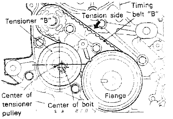 5. When timing belt "B" is installed, make certain that tension side has no slack. Install tensioner "B" with center of pulley located on the left side of mounting bolt and with pulley flange directed toward front of engine.