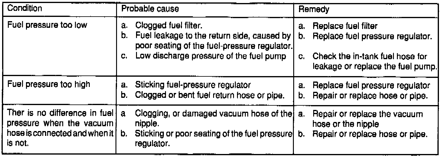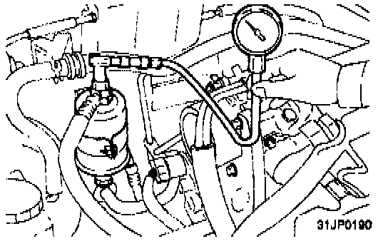 9. Stop the engine and check for a change in the fuel pressure gauge reading, which should hold for approximately 5 minutes. It the gauge indication drops, observe the rate of drop. Determine and remove the causes according to the following table.