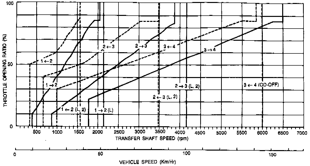 Two shift patterns are pre-stored in the control module of this transaxle. One is the Normal pattern (for more powerful performance), and the other is the Economy pattern (for improved fuel consumption and quieter operation). The driver can select and switch to the desired pattern by using the normal/economy select switch on the center console. The solid lines shown in these shift patterns indicate up-shifts, and the broken lines indicate down-shifts. The reason why there is a difference between the shift points for up-shifts and for down-shifts is so that up-shifts and down-shifts will not occur intermittently when driving at a speed close to that of the shift point. When the vehicle is stopped, there is a shift to second gear in order to obtain a suitable "creeping". Then when the accelerator pedal is depressed, the vehicle starts off in first gear.