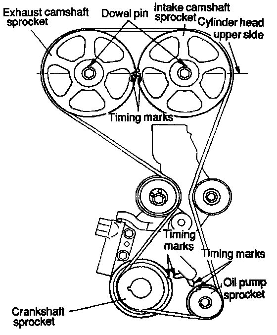 NOTE: At this time the timing marks of the camshaft sprocket and the upper surface of the cylinder head should coincide, and the dowel pin of the camshaft sprocket should be at the upper side. Remove the auto tensioner.