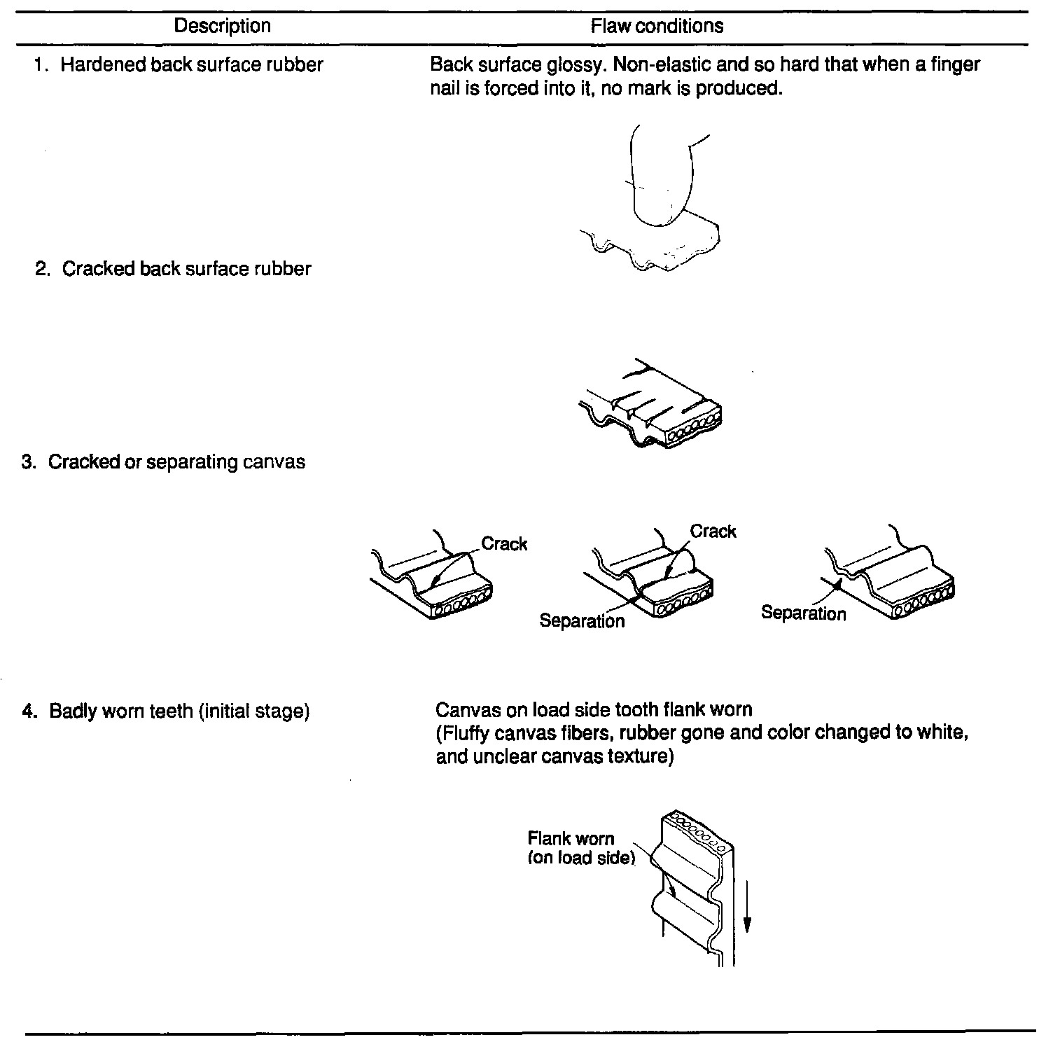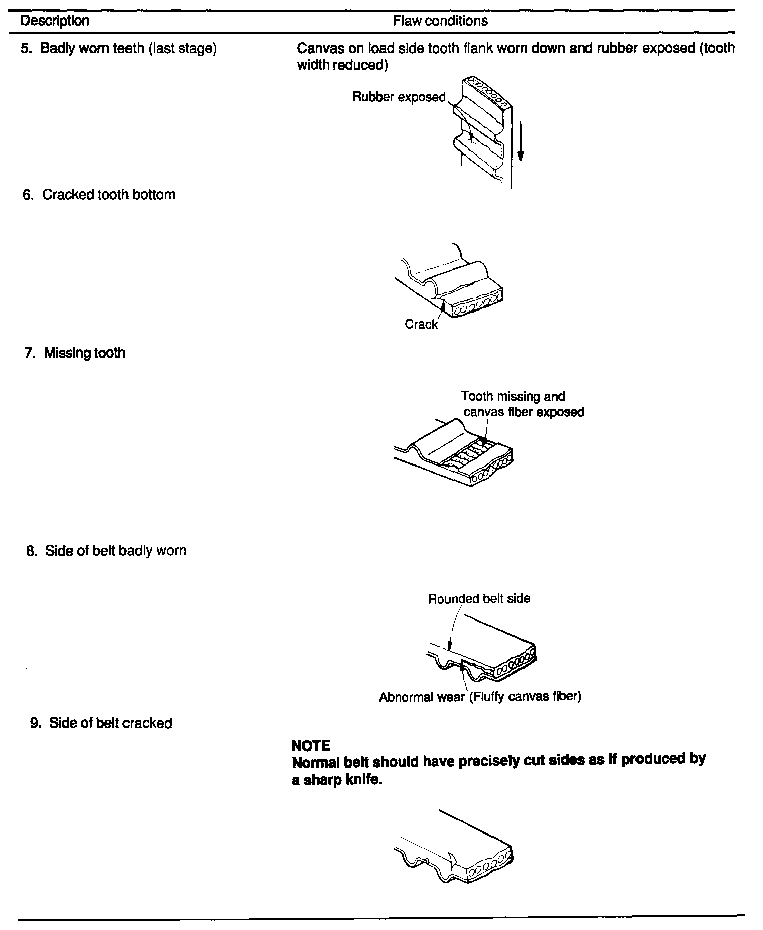 2. When the engine is overhauled or belt tension adjusted, check the belt in detail. If any flaws are evident, replace the belt with a new one.