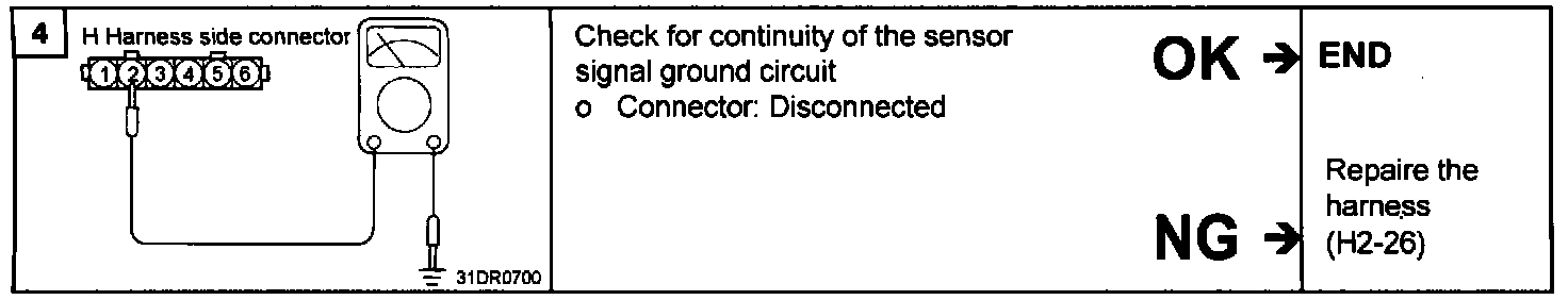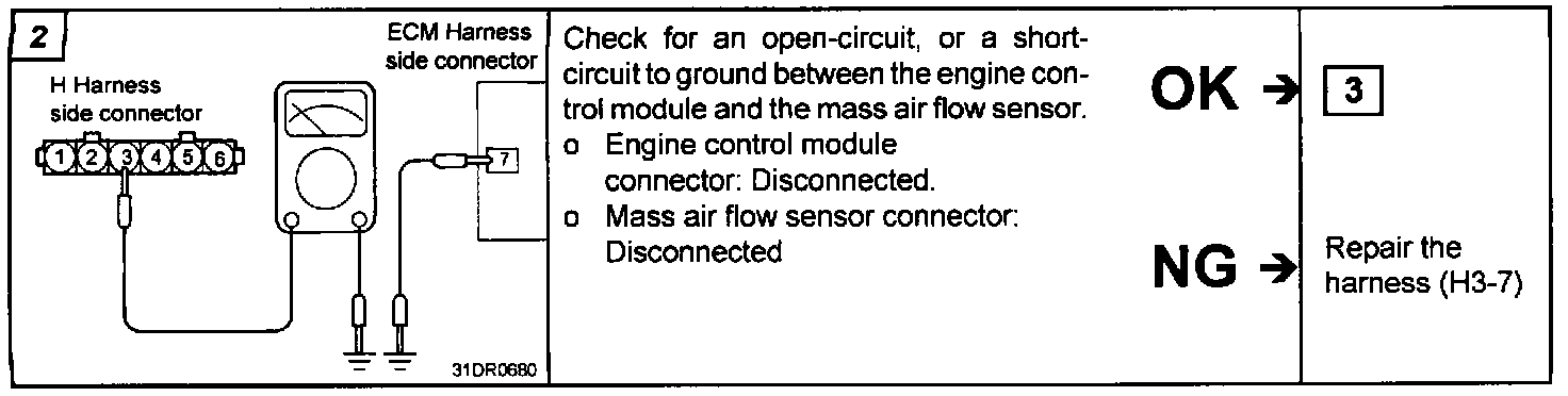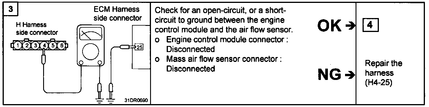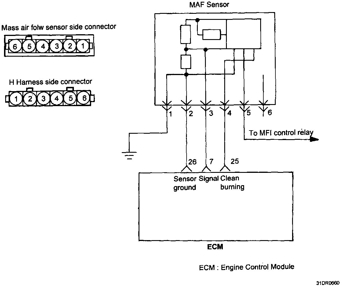 2. If the MAF sensor output voltage is other than 0 when the ignition switch is turned on (do not start the engine). Check for the faulty MAF sensor or Engine Control Module (ECM).