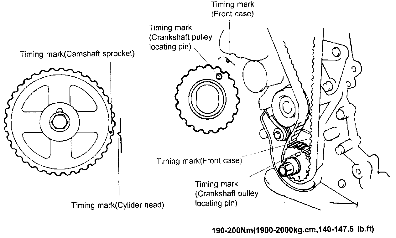 7. Install the timing belt on the camshaft sprocket. When the timing belt is installed on the camshaft sprocket, make sure that the tension side is tight. Then, check to ensure that when the tension side is tightened by turning the camshaft sprocket in a reverse direction. all timing marks are in line.