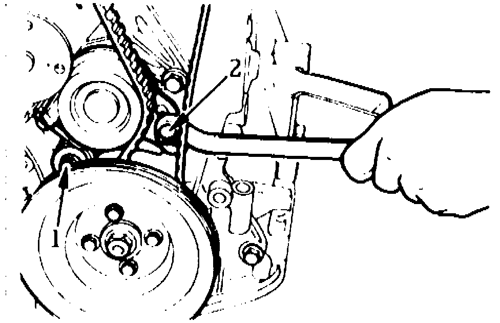 8. Loosen the tensioner mounting bolts 1 and 2 in that order as shown. This will apply spring tension to the timing belt only. Check the belt to ensure that it is not out of position.