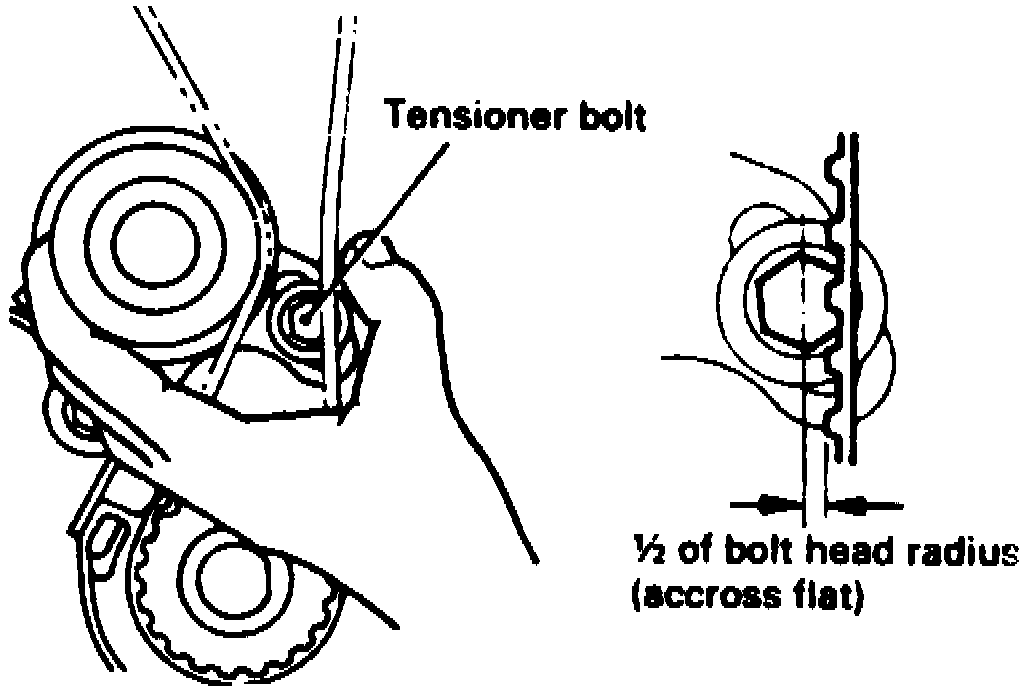 13. Then recheck the belt tension. Verify that when the tensioner and the tension side of the timing belt are pushed in horizontally with a moderate force approx. 49 N (11 lb.) that the timing belt cog end is approx. 1/2 of the tensioner mounting bolt heads, across flats, away from the bolt head center.
