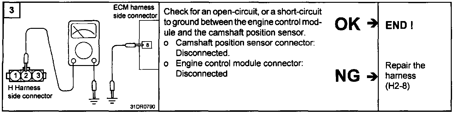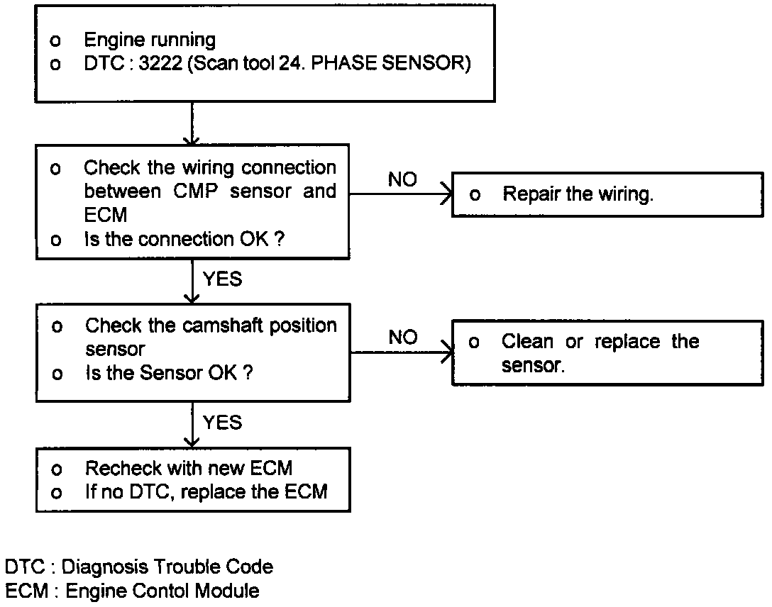 NOTE: If Diagnostic Trouble Code (DTC) (3222) is not erased when battery (-) is reset, it indicates a Camshaft Position Sensor (CMP) fault.