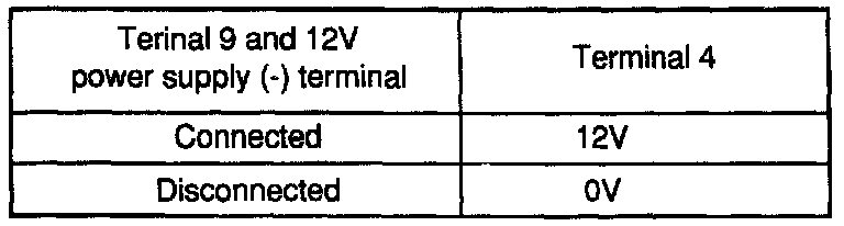 3. Connect a 12V power supply (+) terminal to the terminal 3 of the multipoint fuel injection control relay and measure the voltages at the terminal 4 when the (-) terminal is connected to and disconnected from the terminal 9.