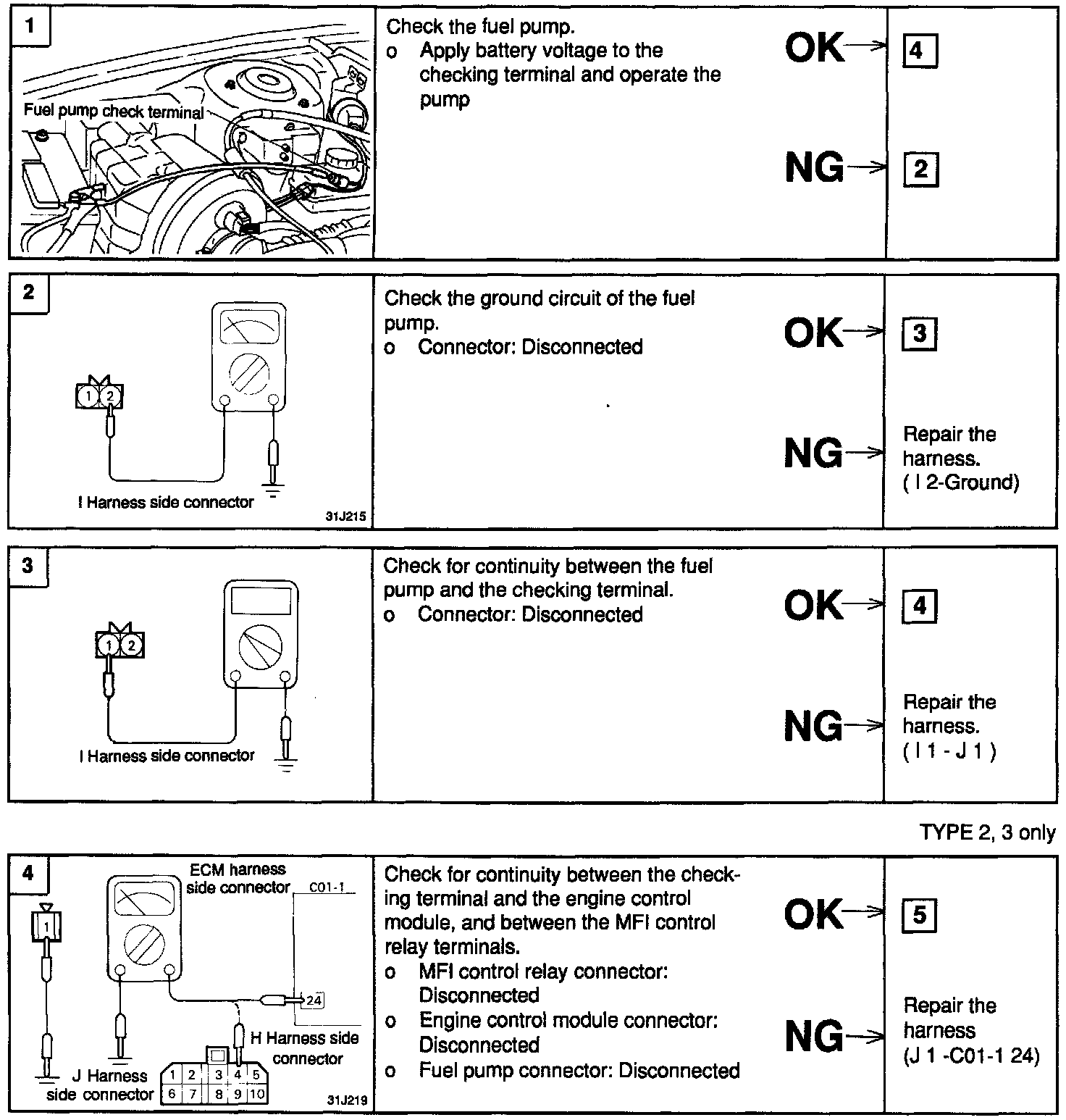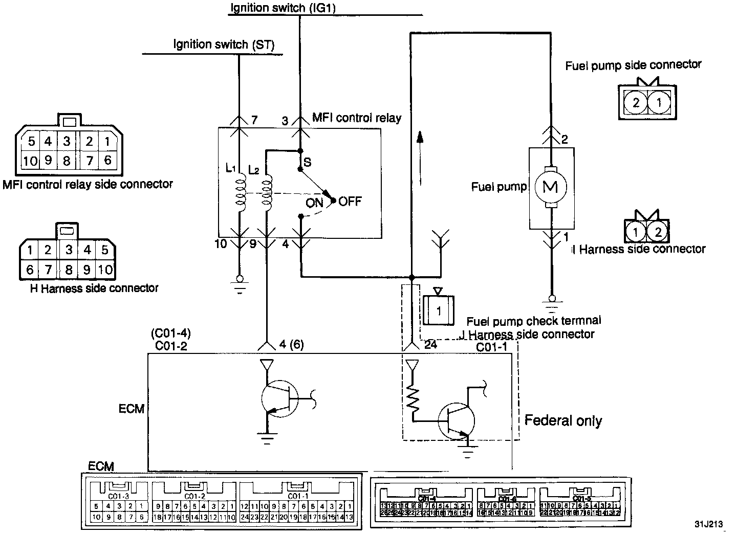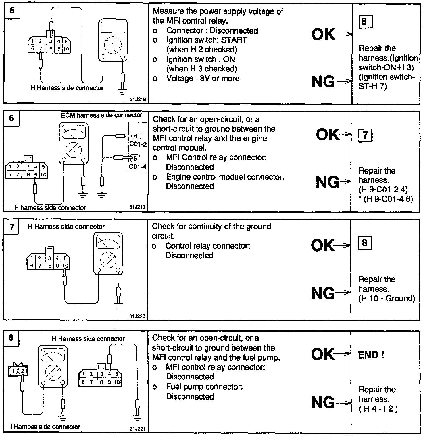 14. Using an Ohmmeter test for continuity between relay terminal 1 and engine control module terminals 4 and 9 (CO1-3 connector)