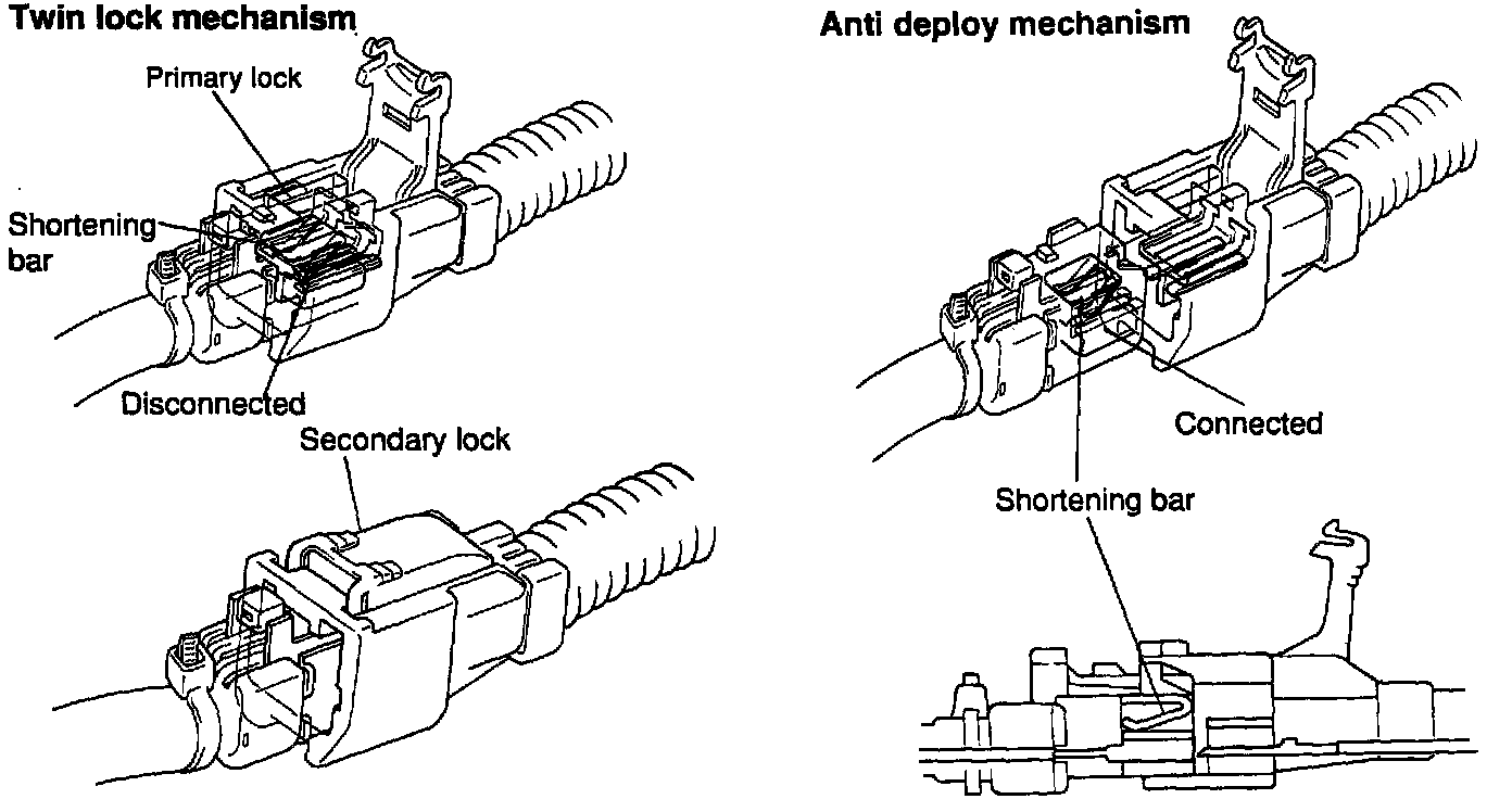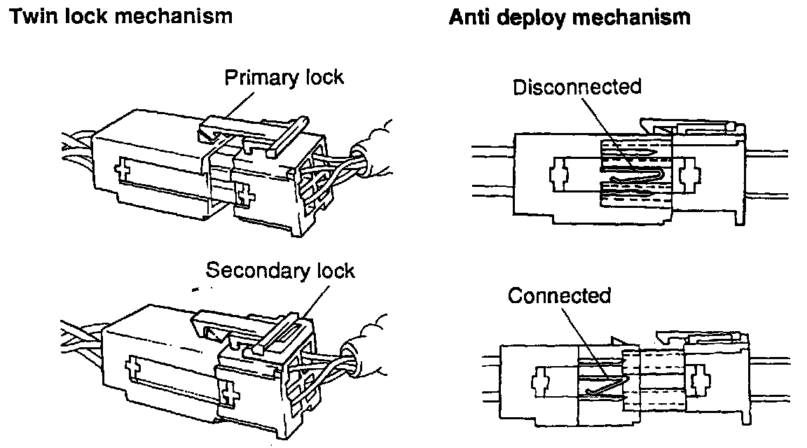 All wiring in the airbag system is wrapped in yellow type to distinguish if from others. For ensuring high reliability, air-bag connectors have special functions and specifically designed. The connectors use gold-plated terminals