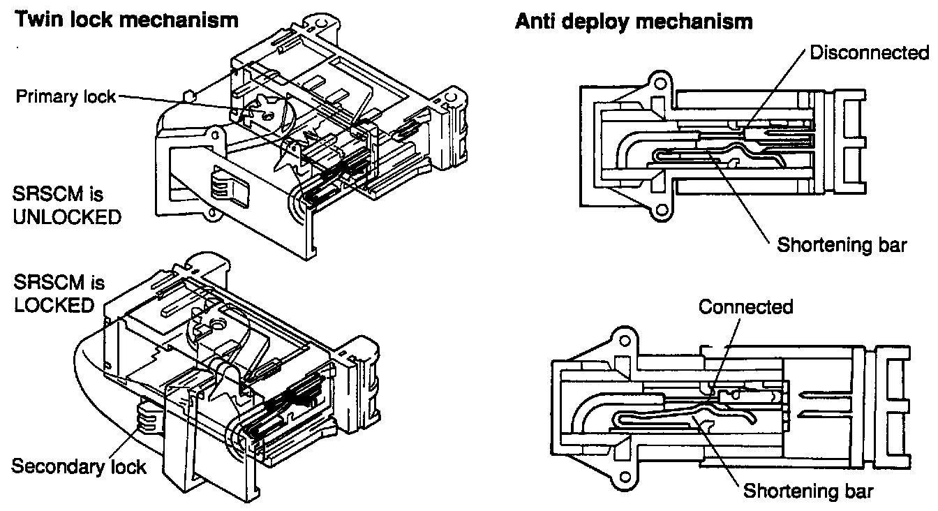 2. Anti-deploy mechanism to prevent unexpected deployment by shortening of the two squib terminals.