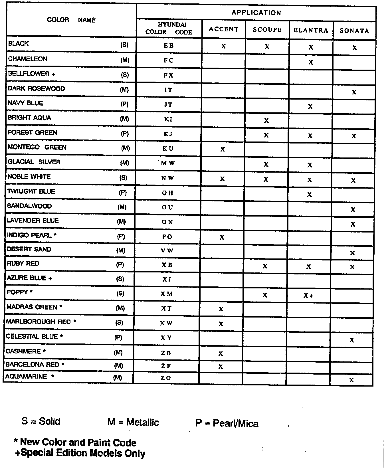TABLE 1: 1995 HYUNDAI EXTERIOR COLOR CODES AND APPLICATIONS