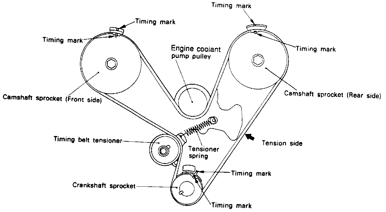 4. Apply force counterclockwise to the rear camshaft sprocket with tension on the tight side of the belt, check that the timing marks are all aligned.