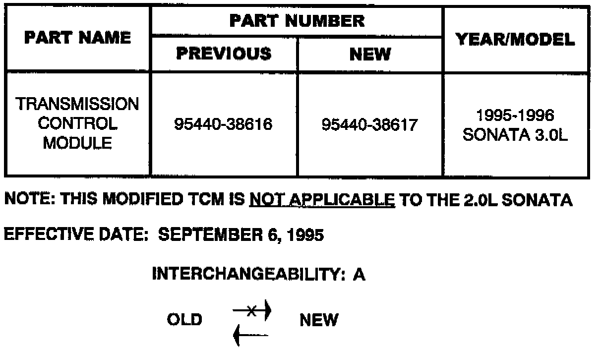 A new Transaxle Control Module (TCM) is available for the 1995 Sonata 3.0L to improve the following conditions:
